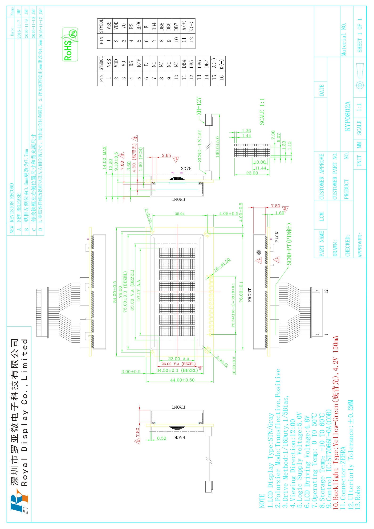 The RYP0802A is a standard 8-character x 2-line character LCD module. It utilizes STN technology with a gray transflective positive display mode, delivering clear, high-contrast visuals under any lighting condition. Driven by the high-performance ST7066U controller, it is fully compatible with the standard HD44780 instruction set and supports an 8-bit parallel interface for easy connection and programming with various microcontrollers. The logic operates at 5V, and it integrates a high-brightness yellow-green LED backlight with a typical current of 150mA. Featuring a robust structure with zebra strip connection for high reliability, it is ideally suited for industrial control instruments, test equipment, office automation devices, and any HMI requiring clear character display.